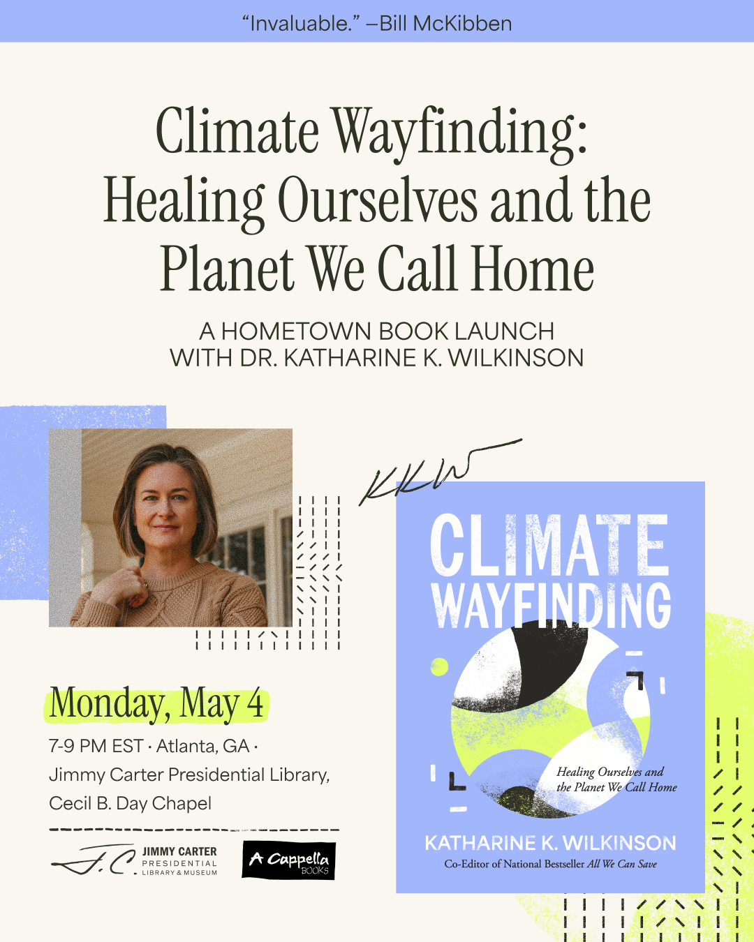 The Jimmy Carter Presidential Library and A Cappella Books welcome Dr. Katharine K. Wilkinson for a special hometown book launch of Climate Wayfinding: Healing Ourselves and the Planet We Call Home. Join Dr. Wilkinson at the Cecil B. Day Chapel to immerse in the wisdom of Climate Wayfinding and the beauty of poetry, art, and song. Amid kindred community, we remember that each of us is a node of possibility for healing the climate crisis—whoever we are and whatever we’ve got to give.