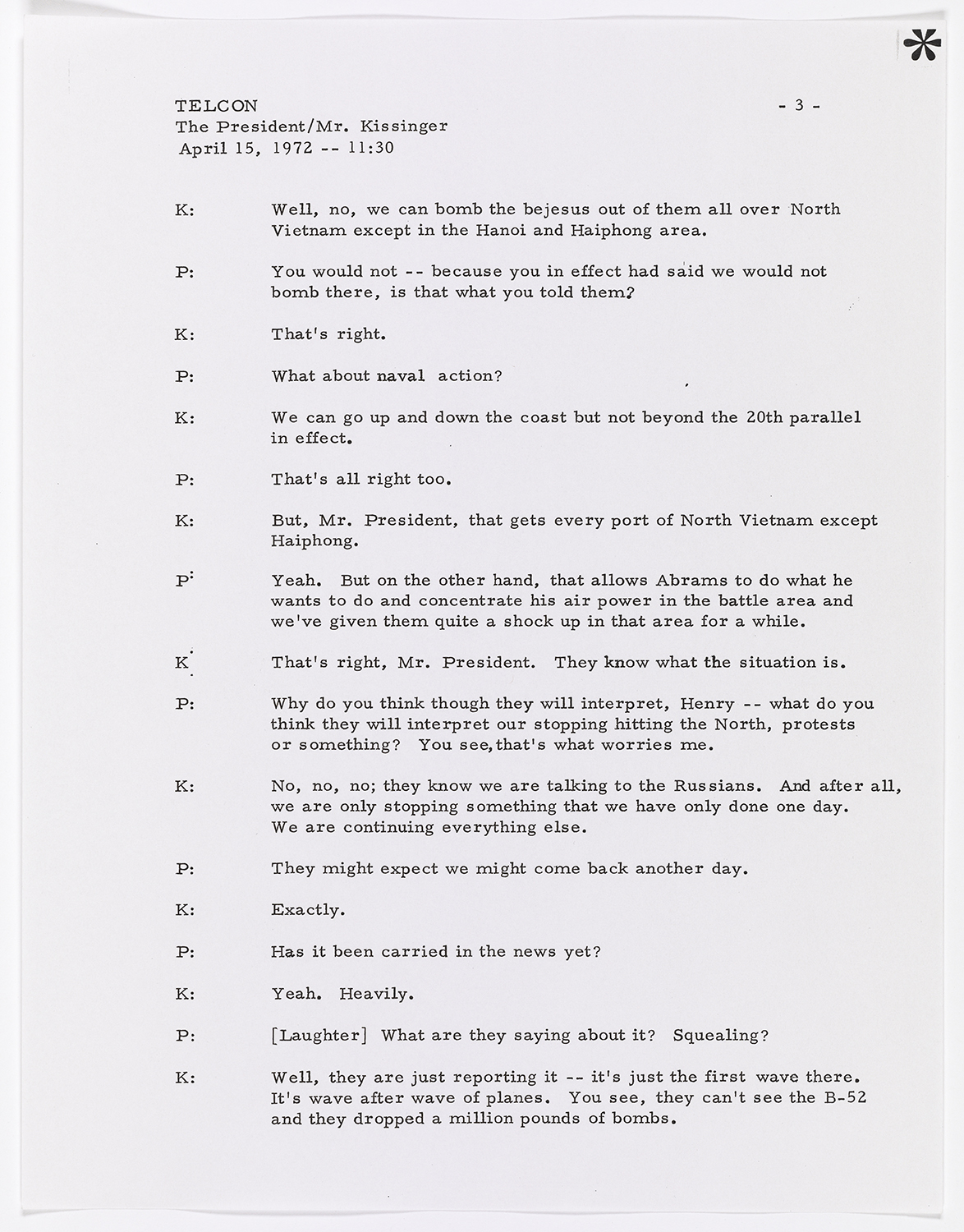 Nixon and Kissinger were each secretly recording their conversations. In this transcription of one of Kissinger’s tapes, he and Nixon revel in the destruction caused by the recent bombing campaign.