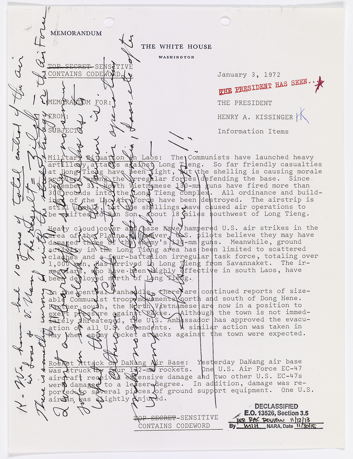 In a CBS interview with Dan Rather, President Nixon said the resumption of bombing had been “very, very effective.” The next day, he scrawled, “K. We have had 10 years of total control of the air in Laos and V.Nam. The result = Zilch,” on the top of this memo.