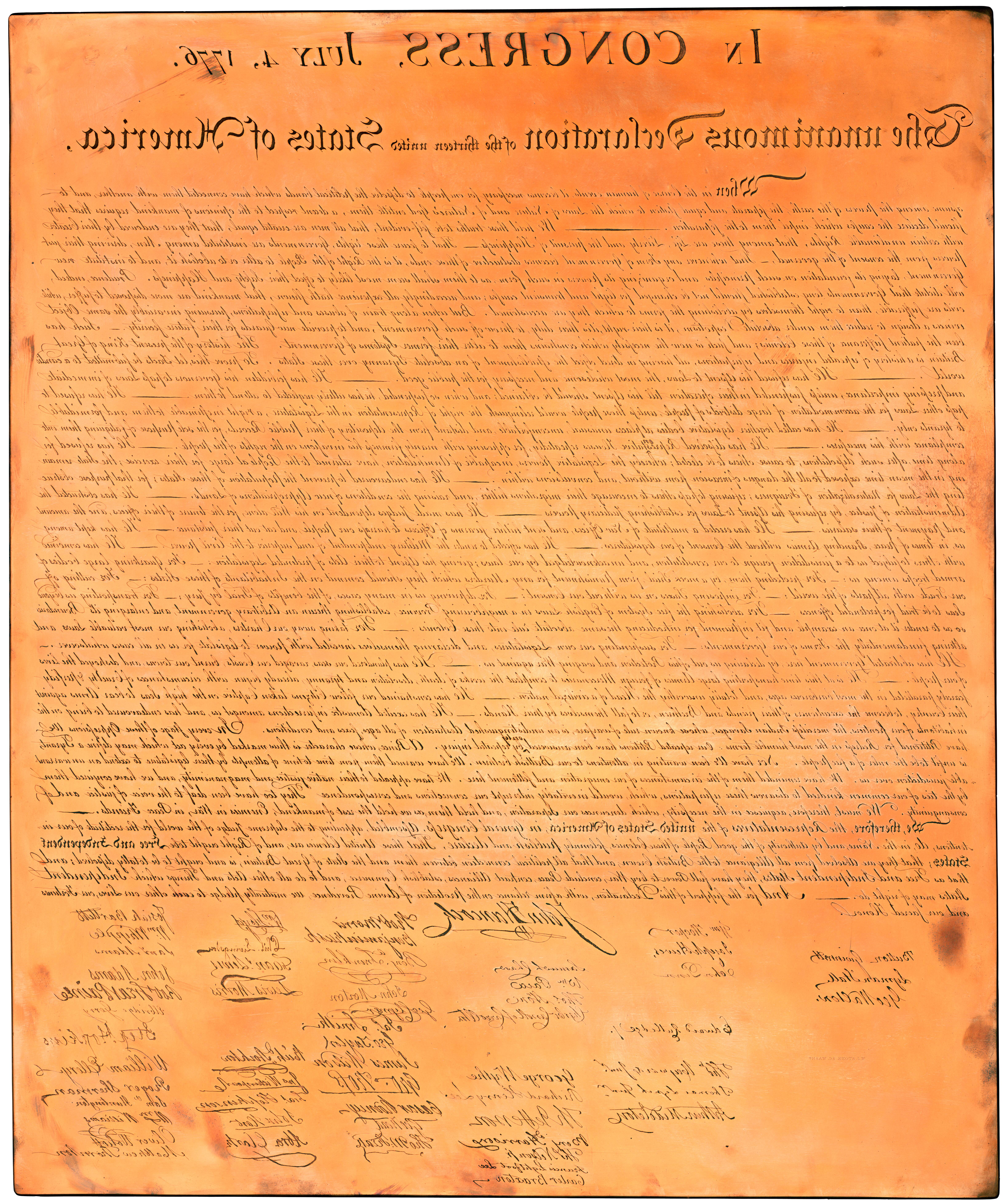 After William Stone printed the 200 copies of the Declaration of Independence, he burnished the top of the copperplate to remove the imprint line, and added a new imprint at the bottom left, below the first column of signatures: “W.J. STONE SC. WASHN.” Later printings from the Stone copperplate were printed on paper instead of parchment including this 1976 Bicentennial print. The original copper plate was housed at the Department of State until it was sent to the National Archives in 1937.