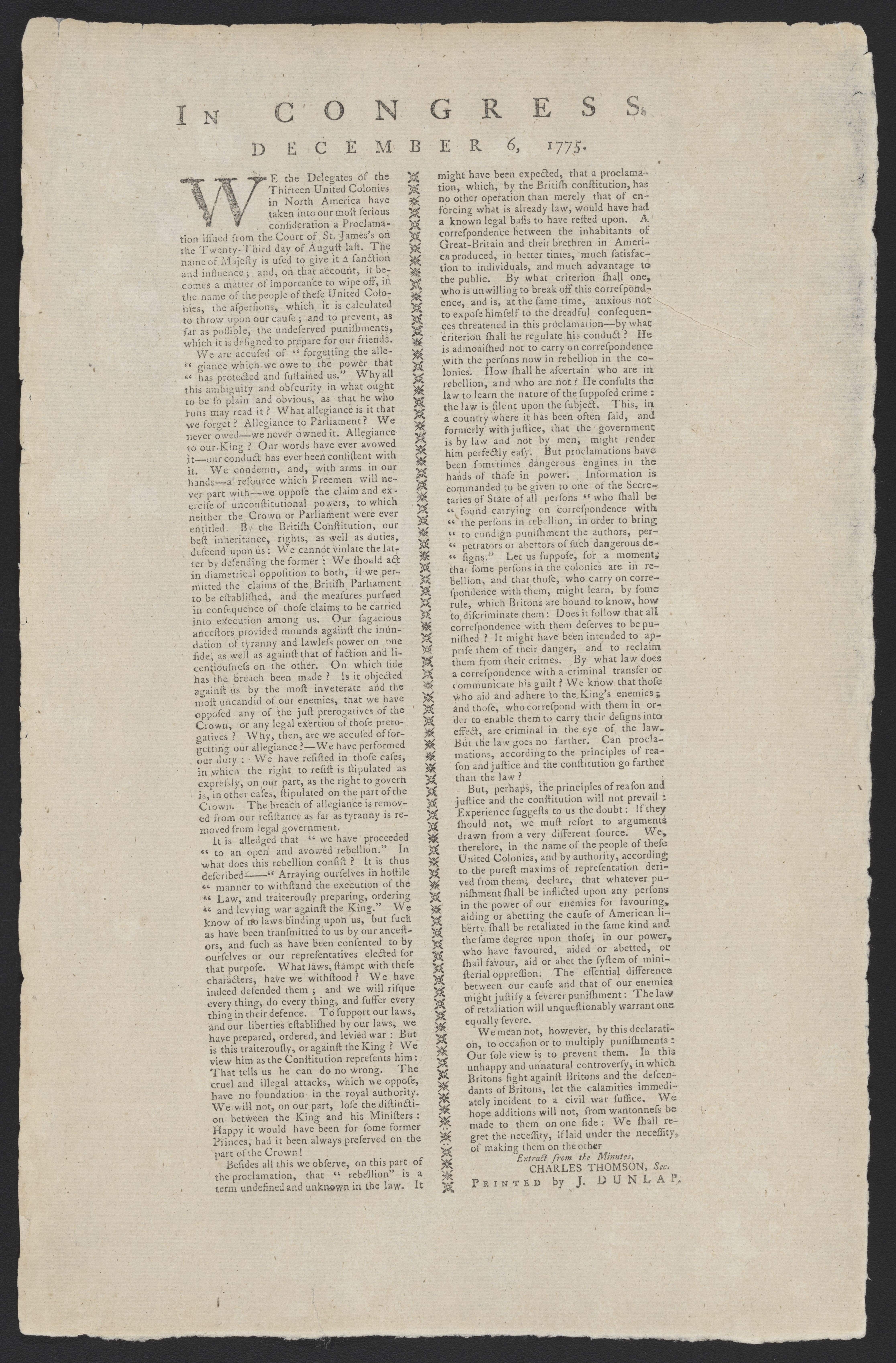 On August 23, 1775, four months after the Revolutionary War had begun, King George issued a proclamation in which he declared the American colonies to be in a state of open rebellion. Congress responded by publishing this broadside, which stated that while the colonies had always been loyal to the King, Parliament had no legitimate claim to authority because of the colonies’ lack of representation in Parliament.