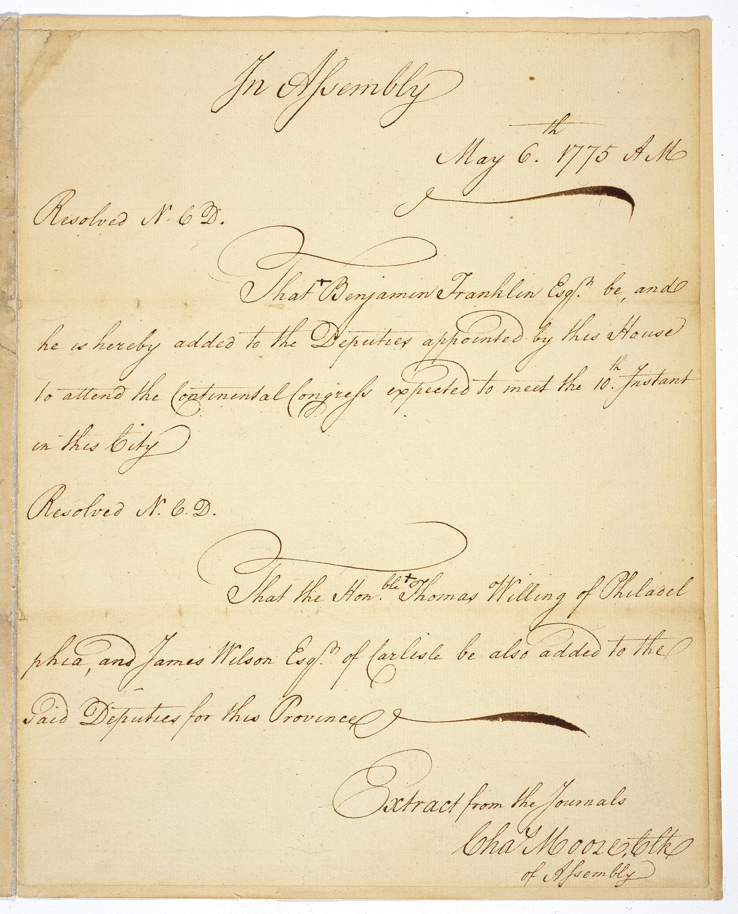Some of the nation’s most influential founders served as delegates to the Second Continental Congress. They were selected by colonial legislatures or conventions, and their credentials served as proof that they had been duly chosen to serve in the Congress. On May 6, 1775, the Pennsylvania Provincial Assembly selected Benjamin Franklin, Thomas Willing, and James Wilson as delegates to represent Pennsylvania in the Second Continental Congress. Pennsylvania’s Provincial Assembly existed from 1682–1776, and was replaced with the Pennsylvania General Assembly once the United States was established in 1776.