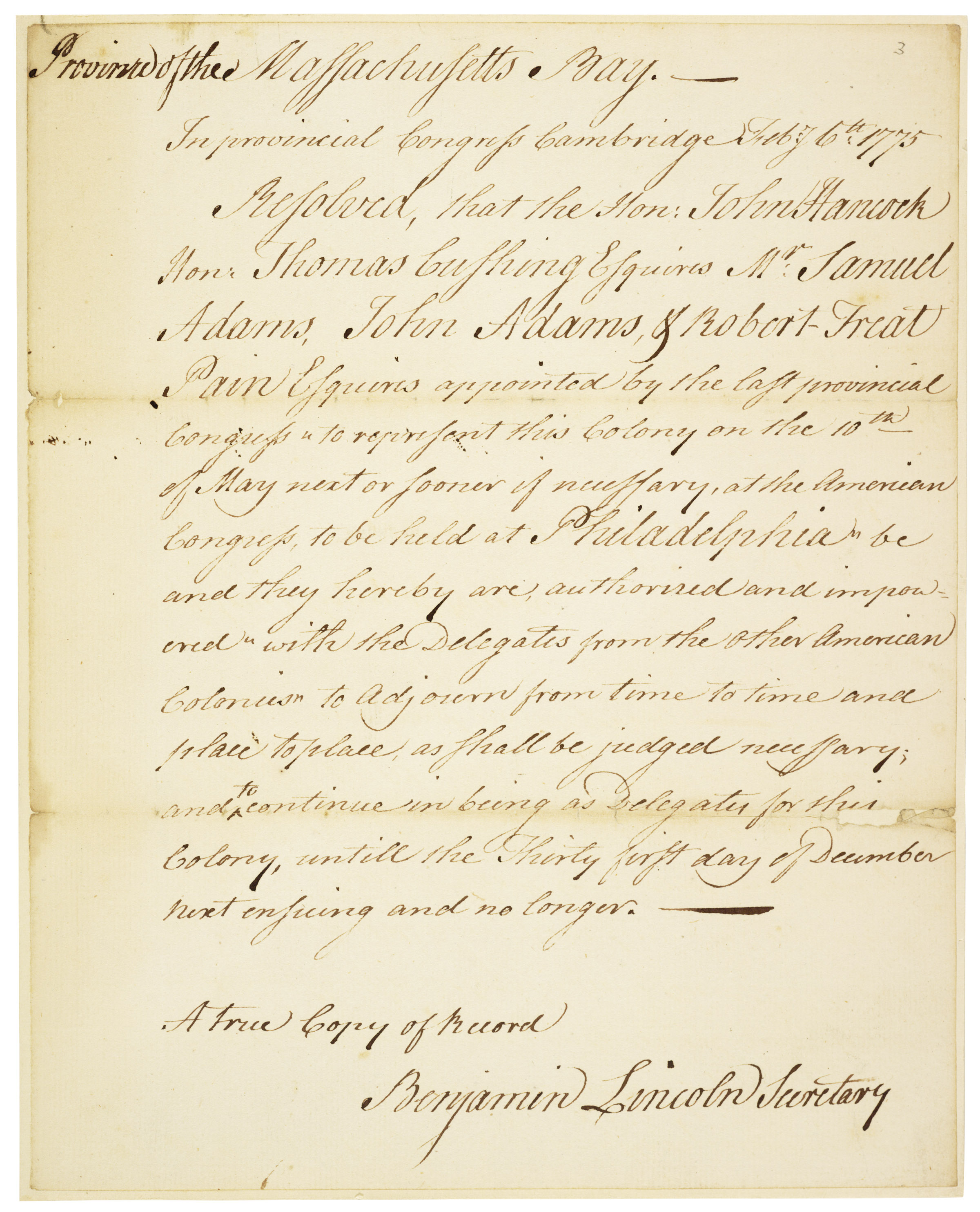 On February 6, 1775, the Massachusetts Provincial Congress selected John Hancock, Thomas Cushing, Samuel Adams, John Adams, and Robert Treat Paine as delegates to represent Massachusetts in the Second Continental Congress. The Massachusetts Provincial Congress was the governing body in opposition to the British Crown-appointed governor and council.