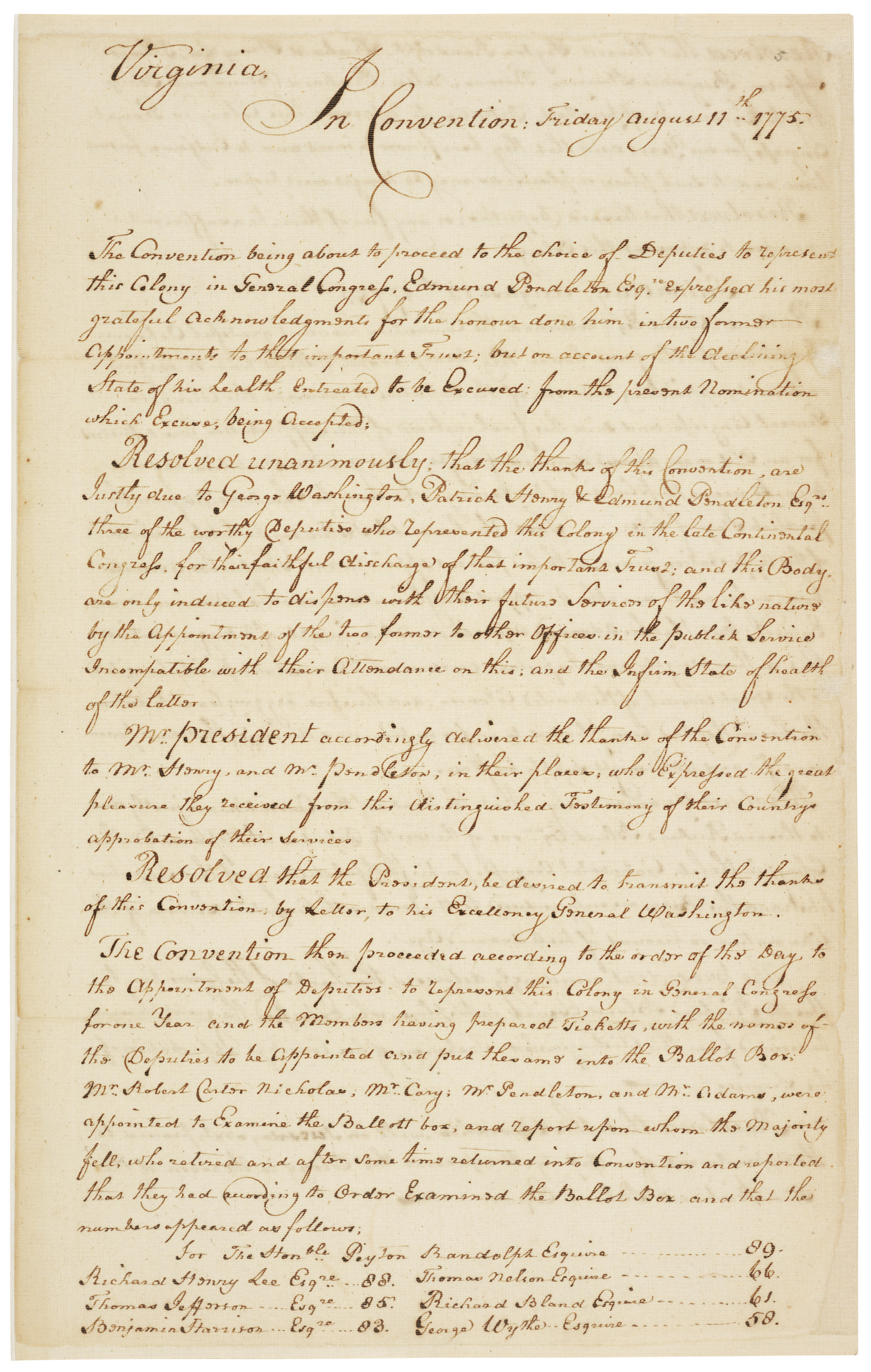On August 11, 1775, Virginia’s Convention selected Peyton Randolph, Richard Henry Lee, Thomas Jefferson, Benjamin Harrison, Thomas Nelson, Richard Bland, and George Wythe as delegates to represent Virginia in the Second Continental Congress. The Proceedings of the Virginia Convention served as the delegates' credentials. It also notes a very special thank-you to “his Excellency General Washington.”