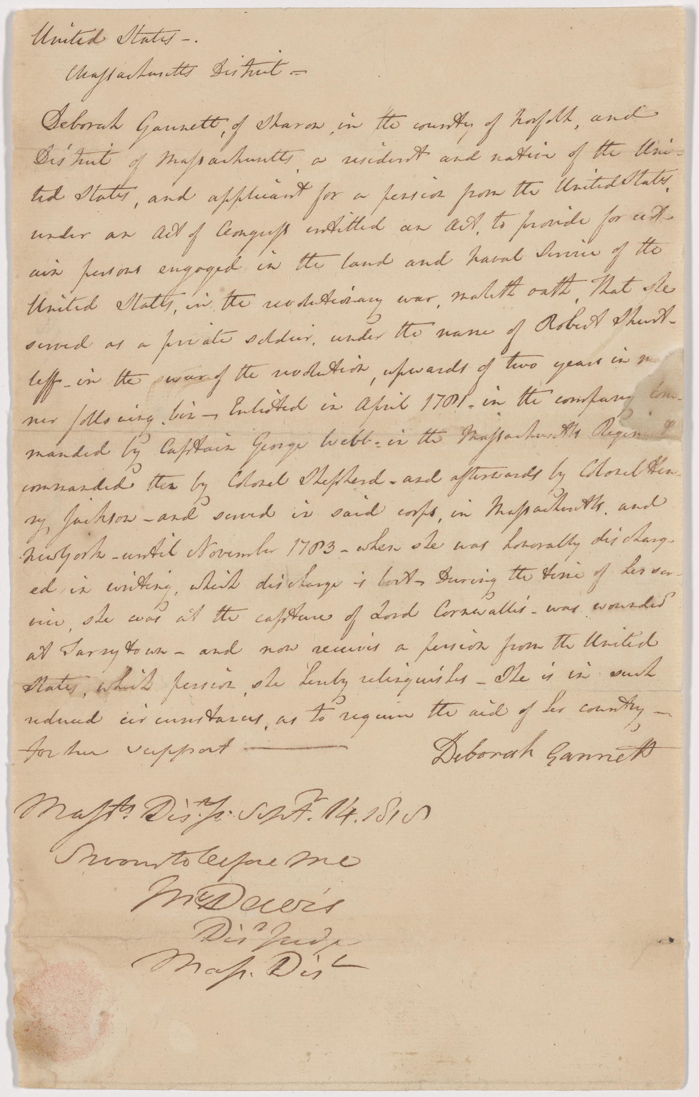Few women bore arms in the Revolutionary War and even fewer served as soldiers. One exception was Deborah Sam(p)son, the only woman awarded a full military pension. Disguised as a man, Samson enlisted in the 4th Massachusetts Regiment under the alias Robert Shurtliff. A poor single woman, Samson’s motivations for enlisting were likely both economic and patriotic. Despite receiving multiple battle wounds, she served undetected for “upwards of two years…when she was honorably discharged” after her identity was discovered. Samson married Benjamin Gannett following the war.