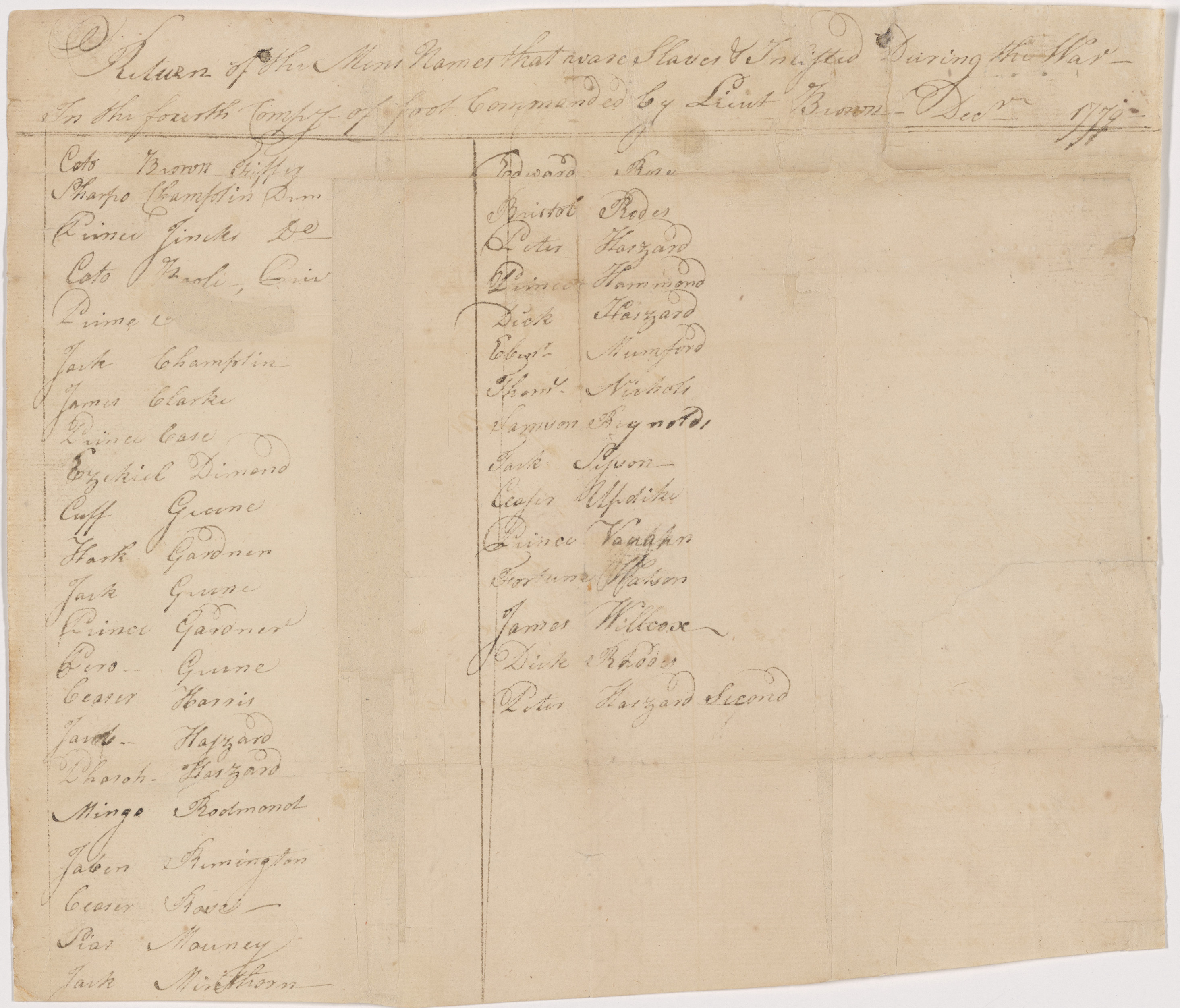 1st Rhode Island Regiment, Return of Men's Names that were Slaves during the War in the 4th Company Commanded by Lieutenant Brown, 1779. ...Read more