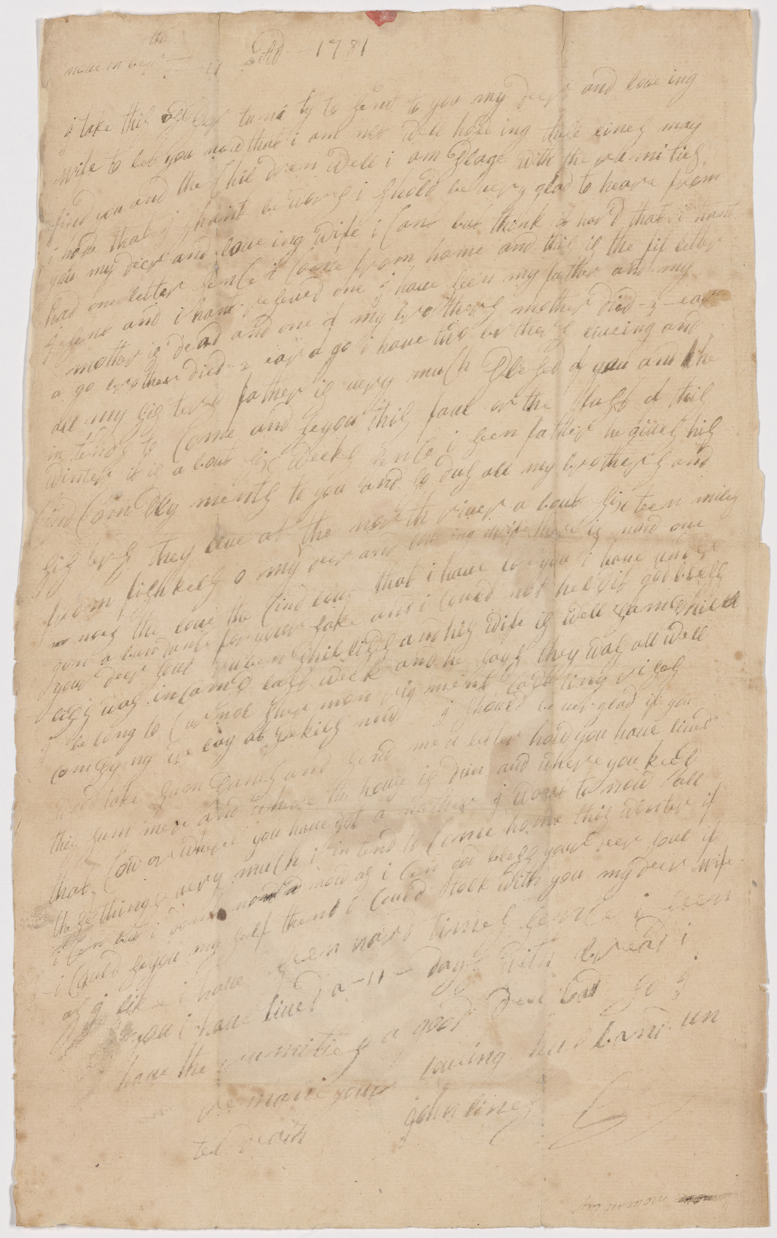 This letter from Private John Lines to his “deer [sic] and loving wife” wife Judith is one of the few Revolutionary War letters by a Black soldier that is known to exist. Lines’s letter documents the “hard times” of life in the Continental Army. His plea to Judith for news about their farm also reveals the economic partnership at the heart of many Revolutionary-era marriages. While men fought at war, women found the means to support their households and protect their families.