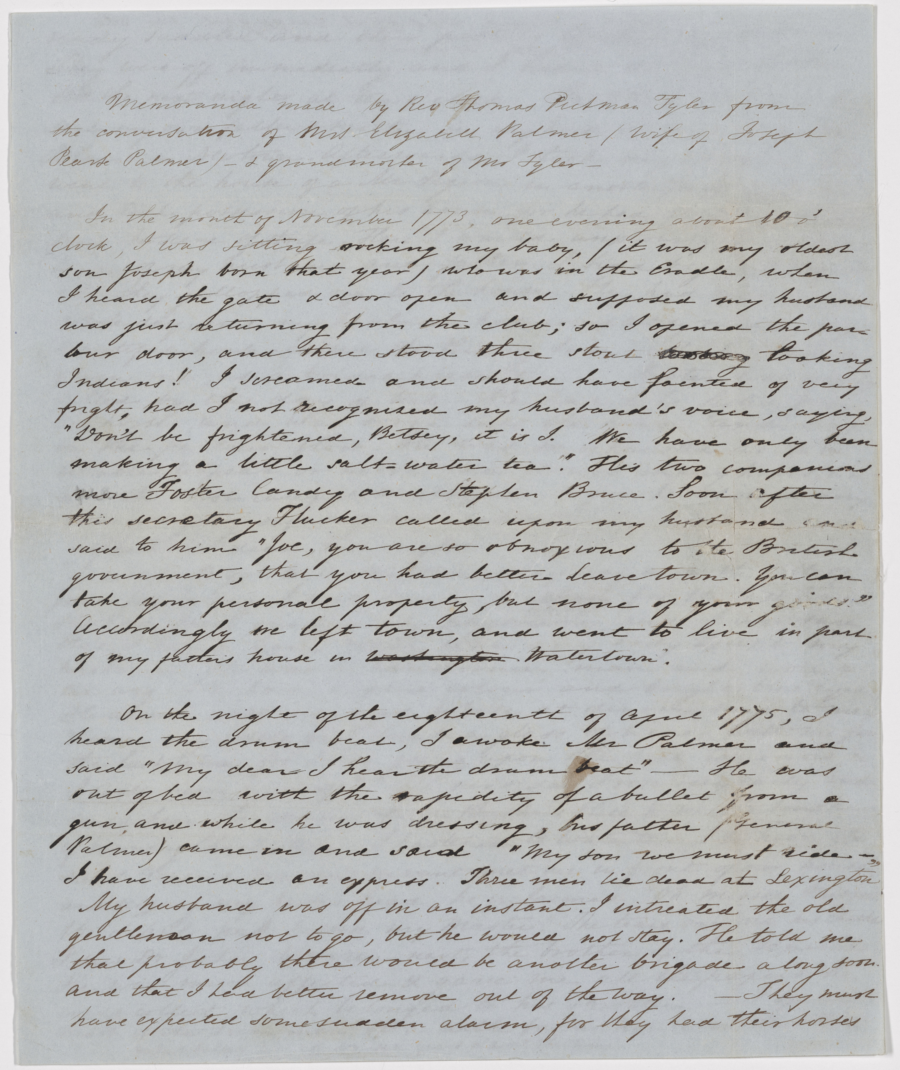 While male family members went to war, their wives, daughters, and mothers took command of households. This statement recounts Elizabeth Palmer’s anxiety as her husband and father rode off to Lexington and Concord, and a terrifying encounter the night of the “Boston Tea Party.” At home with her baby, Palmer heard a noise outside. She screamed after coming face-to-face with three “Indians” until she “recognized [her] husband’s voice, saying, ‘Don’t be frightened…we have only been making a little salt-water tea.’”