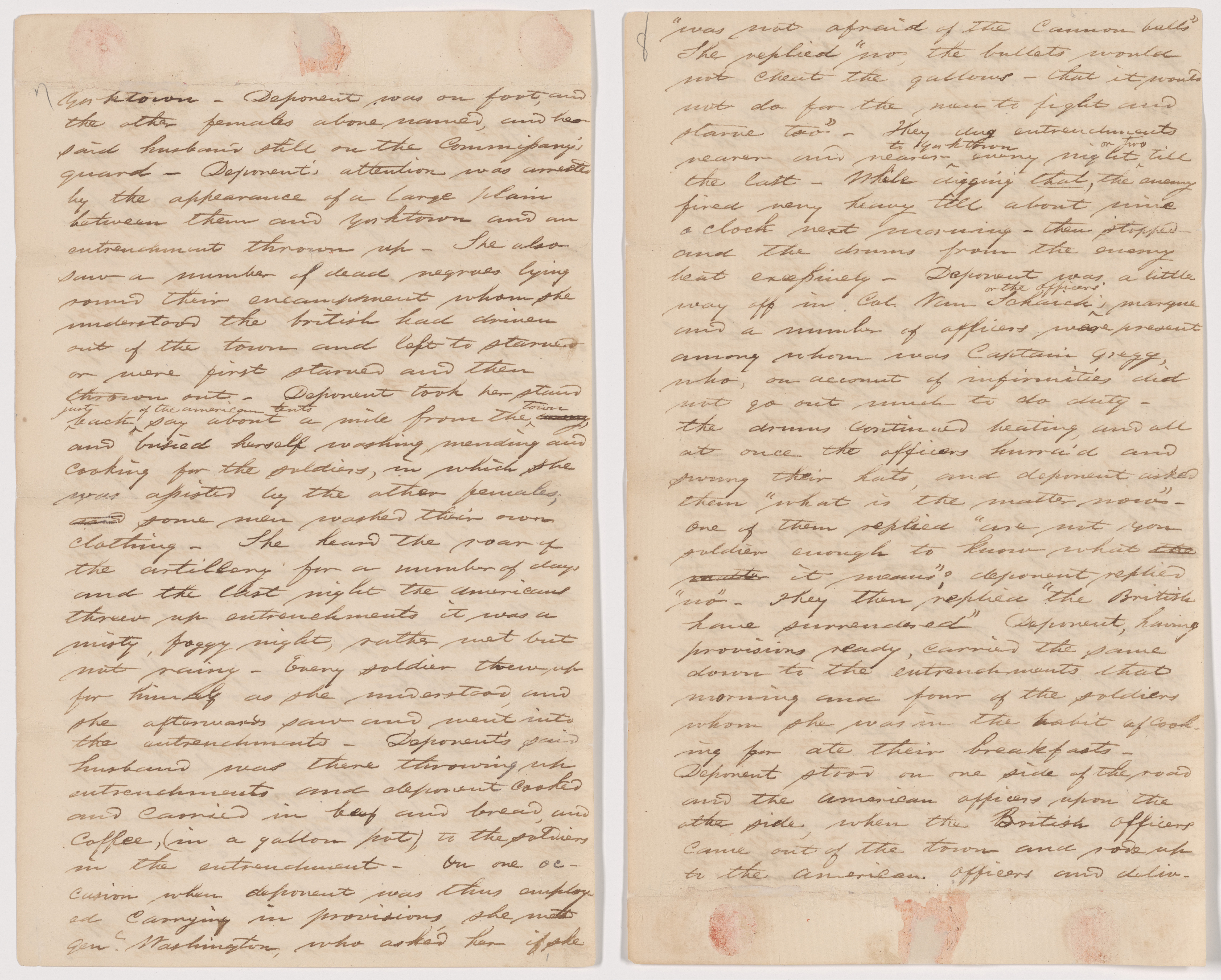 Women were officially barred from military service, but thousands served the military by cleaning, cooking, and caring for soldiers. Like most Army women, Sarah Osborn traveled with Continental troops for financial reasons and to remain close to enlisted male kin. A typical Army woman in most respects, her eyewitness account of the Battle of Yorktown reveals a remarkable encounter. While carrying provisions to the frontline, General George Washington asked her, “Are you not afraid of the cannonballs?” Osborn replied, “It would not do for the men to fight and starve, too.”