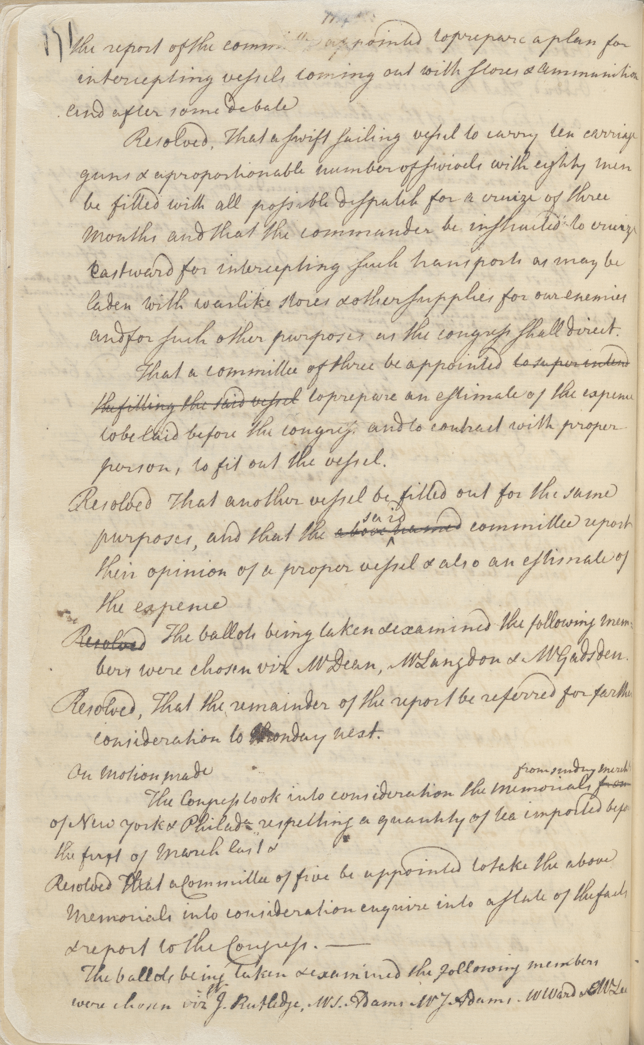 "Resolved, That a swift sailing vessel to carry ten carriage guns and a proportionable number of swivels, with eighty men be fitted with all possible despatch for a cruize of three months and that the commander be instructed to cruize eastward for intercepting such transports as may be laden with warlike stores and other supplies for our enemies and for such other purposes as the Congress shall direct.”