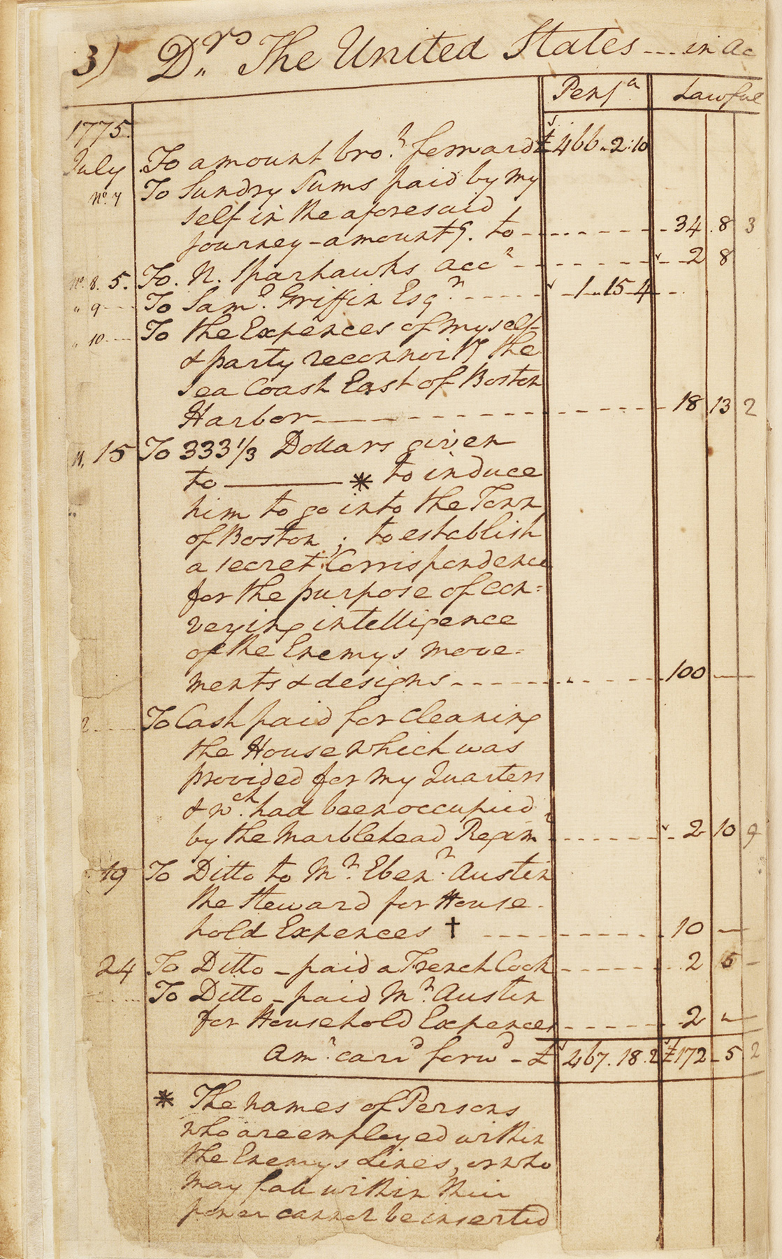 During the Revolutionary War, a large network of colonial spies worked in secret to disrupt British forces. When George Washington took command of the Continental Army in July 1775, he strengthened intelligence efforts by planting false information and writing coded letters to gain an edge over the larger and more experienced British Army. Washington’s account book of wartime spending reveals information about these secret operations.